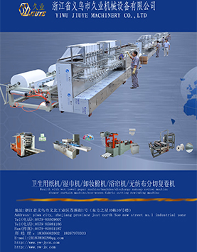 金華市久業(yè)智能科技有限公司專業(yè)制造無紡布機械,餐巾紙機械,濕巾機械設備,集機械設備的生產科研、銷售服務、后勤保障為一體。位于全球關注的浙江義烏工業(yè)園區(qū)內,距離義烏機場,義烏火車站僅10分鐘車程,交通便利。